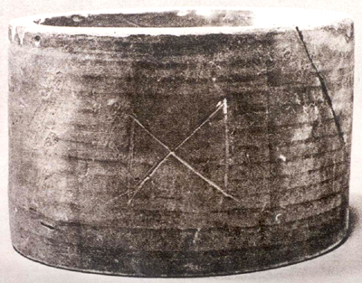 河南登封告城古陽(yáng)城煉鐵遺址出土。戰(zhàn)國(guó)。高10.9、口徑16.7厘米,容1690毫升。直壁,平底。周身飾弦紋。口沿有“陽(yáng)城”印文三方,器壁與底部有三處刻劃“”形符號(hào)。器形與湖北云夢(mèng)出土的陶量相似。戰(zhàn)國(guó)時(shí)陽(yáng)城屬韓國(guó),此器當(dāng)是韓國(guó)所用的量器。
