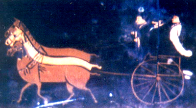 湖北荊門(mén)包山出土。戰(zhàn)國(guó)。此圖為包山大塚出土的漆奩展開(kāi)圖的局部。圖中描繪三匹馬采用我國(guó)獨(dú)創(chuàng)的軛靷式系駕法牽引獨(dú)舟馬車(chē)出行的情景。輿廂內(nèi)立乘三人,御者居前駕馬,待者居中侍立,主人居于后部。由此可見(jiàn),我國(guó)早期馬車(chē)駕御和乘載的真實(shí)風(fēng)貌。