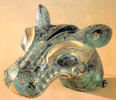 河南輝縣固圍村出土。戰(zhàn)國中晚期。作獸首形,無角,錯金銀,以云紋為地。固圍村大墓屬魏國,有陵園,與河北平山三汲中山王墓類似,時代亦相接近。墓經(jīng)盜掘,遺物不多,這件轅飾的錯金銀技藝與中山王墓所出器物頗近似。