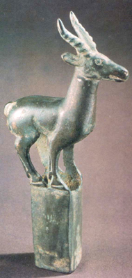 內(nèi)蒙古準(zhǔn)格爾旗玉隆太出土。戰(zhàn)國(guó)中晚期。羚羊昂首伸頸,雙目前視,角斜豎,四足靠攏,立于長(zhǎng)方形銎口。體中空,銎側(cè)有釘孔。此飾件是北方草原地帶游牧民族車上的竿頭裝飾。
