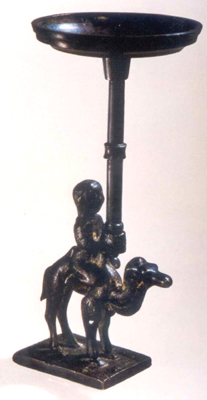 湖北江陵望山出土。戰(zhàn)國中晚期。一人騎于雙峰駝背,手捧筒形座,其中插入燈柱。柱中間有節(jié),頂為燈盤。駱駝的形象,在先秦青銅器中極為罕見。
