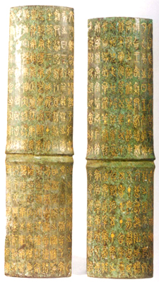 安徽壽縣丘家花園出土。戰(zhàn)國(guó)中晚期。節(jié)作竹節(jié)形,五件可合成圓筒。出土?xí)r共存舟節(jié)一件,車節(jié)三件。節(jié)面各有錯(cuò)金文字九行,舟節(jié)共一百六十三字,車節(jié)共一百五十四字。古代的節(jié)有的剖竹為之,見《周禮·小行人》。此節(jié)作于楚大司馬昭陽敗魏軍于襄陵之年,即公元前三二三年。楚王命大工尹等為鄂君啓鑄節(jié),作為水陸交通的憑 證。銘文詳記交通路線,對(duì)研究當(dāng)時(shí)的地理及交通情況十分重要。