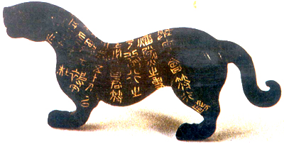 陜西西安北沿村出土。戰(zhàn)國。虎符長9.5厘米、高4.4厘米。杜,是秦都咸陽以南的一個縣(相當于今長安縣)。符為立虎形,頭部有一孔,體內(nèi)側挖凹槽以便與另一半虎符相扣合。此符背部有錯金銘文:“兵甲之符,右在君,左在杜。興士被甲,用兵五十人以上,必會君符,乃敢行之。燔燧之事,雖毋會符,行(也)”。從上述銘文可知,這件符是當時秦國調(diào)兵出行的憑證。