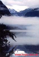 然烏湖美,帶有奇特險(xiǎn)峻的雄姿;易貢湖美,具有清秀俊俏的魅力。海拔2200米的易貢湖,位于喜馬拉雅山脈北側(cè),然而卻呈現(xiàn)出山脈南側(cè)具有的亞熱帶風(fēng)光。湖泊四周,常綠闊葉林和針葉林混雜而生,野生的木瓜飄散著芳香,猴群在森林中嬉戲,勤勞的藏族同胞在湖泊的四周種上了清香可口的易貢茶,一片片的蘋(píng)果園點(diǎn)綴在叢林中。到了采茶的季節(jié),苗條美麗的藏族姑娘背上背簍,舞動(dòng)著修長(zhǎng)靈巧的雙手,仿佛剪修花枝一樣把一撮撮嫩綠的茶葉摘入竹簍,留下一簇簇美麗的花樹(shù);清脆悅耳的歌聲伴隨著有節(jié)奏的采茶舞姿,宛如一幅幅天宮仙女戲春圖。清晨,寧?kù)o的湖面上水汽蒸騰,形成變幻莫測(cè)、奇形異狀的霧氣。時(shí)而像蛟龍戲水,時(shí)而似萬(wàn)馬奔騰,時(shí)而在山腰上形成一條霧帶,宛如為美麗的青山系上潔白的哈達(dá),時(shí)而霧氣籠罩整個(gè)湖面,仿佛浩瀚的云海展現(xiàn)在眼前。最有趣的是,湖面上奇特的景象在湖中形成的倒影,組成了千變?nèi)f化的美麗圖案。令人心曠神怡。 7月28日,大雨滂沱,當(dāng)夜位于通麥南面十公里的第114道班處,爆發(fā)了一場(chǎng)大型的泥石流,隔絕了我們與住在米林大部隊(duì)的聯(lián)系,糧油無(wú)法補(bǔ)給。為了維持工作,雖說(shuō)有點(diǎn)清貧,但也頗有野趣。直到8月15日,第114道班處才修通,按照大隊(duì)的計(jì)劃,我們的易貢湖觀測(cè)終止。