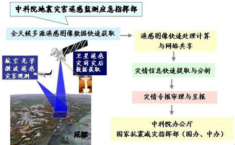 解決方案和科學(xué)原理 5月12日汶川大地震發(fā)生后,中國科學(xué)院馬上成立了抗震救災(zāi)遙感應(yīng)急指揮部。在抗震救災(zāi)遙感應(yīng)急指揮部的直接指揮下,成立了由中國科學(xué)院對地觀測與數(shù)字地球科學(xué)中心牽頭7所聯(lián)合的“汶川地震災(zāi)害遙感監(jiān)測與災(zāi)情評估工作組”,建立起數(shù)據(jù)獲取、數(shù)據(jù)處理、災(zāi)情信息提取與分析、災(zāi)情專報(bào)的災(zāi)情評估體系,組織了一支由對地觀測中心、遙感所、地理與環(huán)境資源研究所、地質(zhì)與地球物理所、成都山地所、生態(tài)中心等院內(nèi)多家單位組成的專業(yè)隊(duì)伍,利用遙感技術(shù)為應(yīng)急救災(zāi)、減災(zāi)提供空間信息服務(wù)。