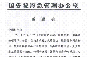 國務(wù)院應(yīng)急辦公室專門為救援隊(duì)發(fā)來了感謝信,寫道:“貴單位卜智勇同志及其工作小組,懷著強(qiáng)烈的責(zé)任感和使命感全身心投入工作,不怕疲勞、認(rèn)真負(fù)責(zé)、夜以繼日、堅(jiān)守崗位、團(tuán)結(jié)協(xié)作,高質(zhì)量、高效率的完成了堰塞湖現(xiàn)場(chǎng)圖像采集和系統(tǒng)保障任務(wù),實(shí)時(shí)提供給國務(wù)院抗震救災(zāi)總指揮部,為奪取抗震救災(zāi)工作的勝利做出了應(yīng)有的貢獻(xiàn)”。 中共中央總書記胡錦濤同志也委托令計(jì)劃同志打電話給中科院領(lǐng)導(dǎo),對(duì)救援隊(duì)的工作表示感謝!
