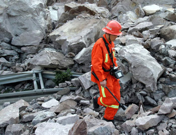 搜救犬發(fā)現(xiàn)幸存者后,救援隊(duì)通過先進(jìn)儀器進(jìn)行準(zhǔn)確定位,然后艱難地實(shí)施營(yíng)救。