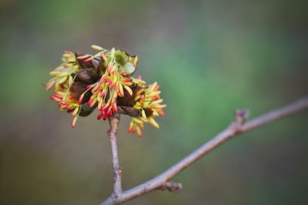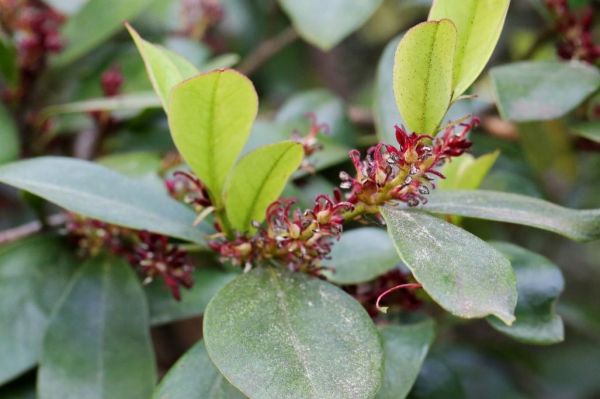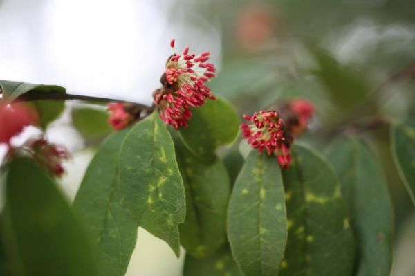 銀縷梅花的奇特,不僅在于沒有花瓣,還在于它的花也分雌雄。研究發(fā)現(xiàn),銀縷梅植株上的花朵大部分是雌雄同花,只有很少一部分是單雄花。即使是雌雄同花的花朵,它的雌花也藏在花底很難被發(fā)現(xiàn)。所以,我們常常只看到銀縷梅紅艷的雄花花藥,并沒有看到雌花。