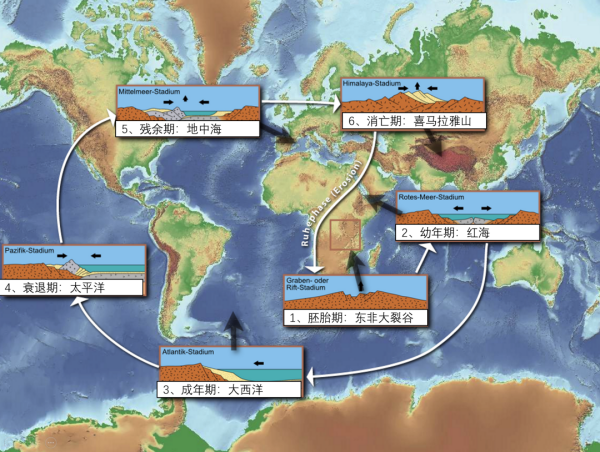我們在目前的地球上就能找到各個生長階段的海洋:裂谷-小洋盆-成熟的洋盆-消亡階段的洋盆-死亡即將閉合的洋盆-完全閉合的洋盆。這在地質(zhì)學(xué)中被稱為威爾遜循環(huán)。