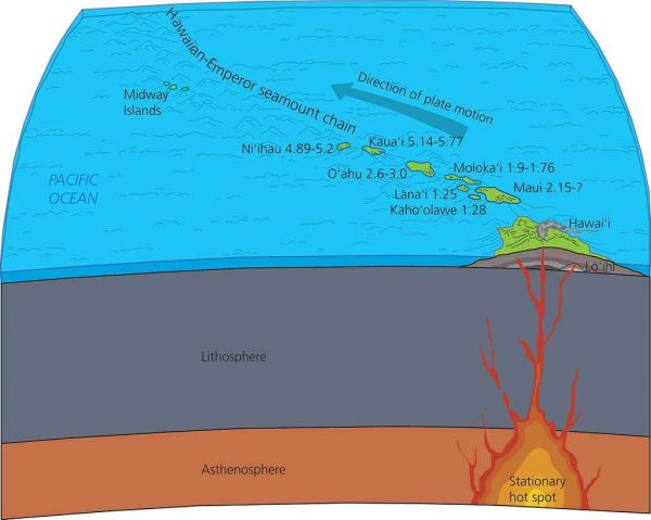 當(dāng)然,還有另外一些海底火山。它們的形成與地幔熱柱的活動有關(guān)系。在地幔處并不是處處均勻受熱的,其中部分地幔物質(zhì)要比其他地方熱很多,熱了就會向上跑,于是它們就會形成直達(dá)地殼之下的地幔熱柱,地幔熱柱頂端可能還會分出不少分支小熱柱來,它們的活動也會頂破薄薄的洋殼的束縛,成為不斷噴涌的海底火山。夏威夷島鏈的形成就與此有關(guān)。