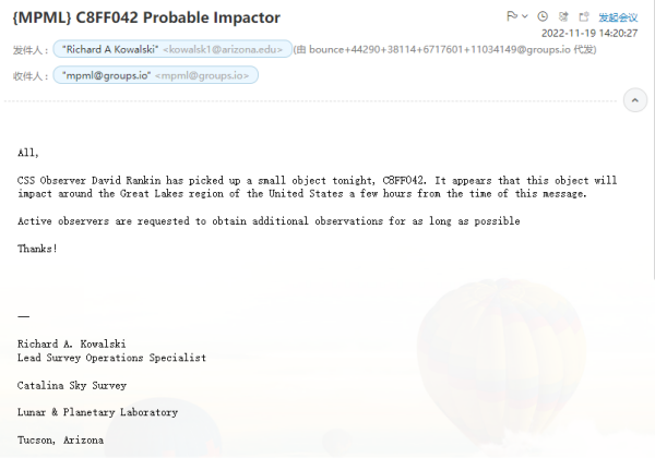 格林尼治時(shí)間 6時(shí)20分(當(dāng)?shù)貢r(shí)間凌晨2時(shí)20分,距離小行星撞擊約2小時(shí)),卡特琳娜系統(tǒng)的首席運(yùn)營專家Richard A. Kowalski向小天體郵件列表( Minor Planet Mailing List,MPML)群發(fā)了一則消息——卡特琳娜巡天系統(tǒng)發(fā)現(xiàn)了一顆看起來要撞擊地球的小行星C8FF042,呼吁全球觀測者對該小行星進(jìn)行觀測,以獲得盡可能多的數(shù)據(jù)。MPML郵件列表聚集了來自全球不同地區(qū)的天文專家和愛好者。美國天文學(xué)家Bill Gray預(yù)測該小行星將于格林尼治時(shí)間8時(shí)26分55秒隕落在美國與加拿大邊境的安大略湖畔布蘭特福德上空。有人嘗試進(jìn)行了跟蹤,發(fā)現(xiàn)這顆小行星移動(dòng)太快了,望遠(yuǎn)鏡無法跟上這顆小行星,但編號(hào)為H36和T12的望遠(yuǎn)鏡還是成功地“逮”到了這顆小行星。有人開始在社交平臺(tái)發(fā)布消息,呼吁還沒有睡眠的“夜貓子們”對即將到來的小行星進(jìn)入大氣層引發(fā)的火流星場景進(jìn)行觀測。