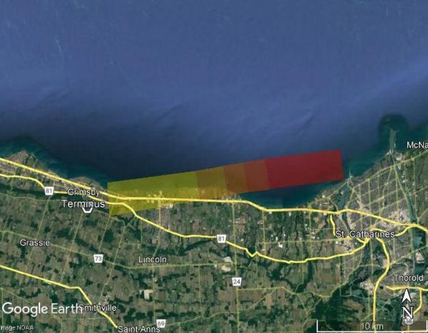 格林尼治時(shí)間7時(shí)55分(當(dāng)?shù)貢r(shí)間凌晨3時(shí)55分,距離小行星撞擊約0.5小時(shí)),位于冒納凱阿火山頂、編號(hào)為T12的夏威夷大學(xué)88英寸望遠(yuǎn)鏡捕獲了這顆小行星的最后一副圖像,隨后這顆小行星進(jìn)入了地球的陰影之中,沒有望遠(yuǎn)鏡能夠再次看到這顆小行星。但小行星闖入大氣層后,在大氣摩擦和燒蝕作用下,小行星的動(dòng)能會(huì)轉(zhuǎn)化為光能向外輻射,將形成明亮的火流星。由于這顆小行星進(jìn)入大氣層的角度僅有10 左右,它將以接近水平的角度撞向地球,這意味著掠過的軌跡將非常長,安大略湖畔居民如果還處于清醒狀態(tài),將能見證這顆拖著尾巴的小行星火球在劃過長長的軌跡后撞向地球。有人開始帶著便攜式拍攝設(shè)備來到戶外,等待這顆小行星進(jìn)入大氣層。