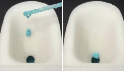 科學(xué)家先后在使用這種涂層制造的馬桶內(nèi)壁上測(cè)試了水、人造混合糞便、真實(shí)糞便,發(fā)現(xiàn)LEES涂層能夠?qū)⒓S便這樣的粘彈性流體的附著力降低約90%,基本做到了“不粘連”。