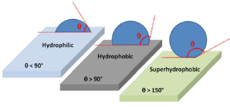 這是因?yàn)椴牧媳砻娣肿又g的相互作用力大于水分子與表面之間的作用力。而對(duì)應(yīng)地,材料表面分子之間的相互作用力小于水分子與表面之間的作用力的表面,具有親水性(hydrophilic)。