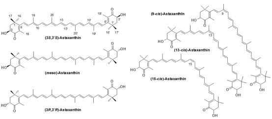 不同來源的蝦青素其結(jié)構(gòu)不同:人工合成的蝦青素是以上3種結(jié)構(gòu)蝦青素(3種異構(gòu)體)的混合物,具有極低的生物活性;酵母菌中合成的蝦青素是具有部分生物活性的蝦青素;雨生紅球藻中合成的蝦青素與鮭魚等水產(chǎn)養(yǎng)殖生物體內(nèi)的蝦青素構(gòu)型基本相同,具有極強(qiáng)的生物學(xué)活性。