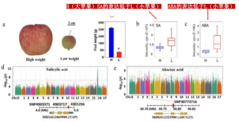 不僅如此,科學(xué)家還成功破案了影響蘋(píng)果個(gè)頭大小的因素。蘋(píng)果大小和脫落酸(ABA)與水楊酸(SA)表達(dá)有關(guān),果子越小其脫落酸(ABA)和水楊酸(SA)含量越高。