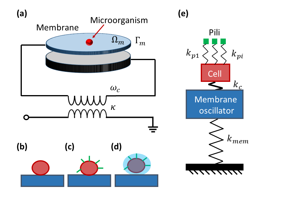 近年來,科學(xué)家在低溫超導(dǎo)電路系統(tǒng)中把直徑15微米,厚100納米的鋁薄膜機(jī)械振子冷卻到量子基態(tài),并制備其量子疊加。2016年,與李統(tǒng)藏合作,我們提出把細(xì)菌冷凍后粘到這個(gè)薄膜表面(如圖2所示)。如果制備薄膜的量子疊加態(tài),也就實(shí)現(xiàn)了細(xì)菌的量子疊加。