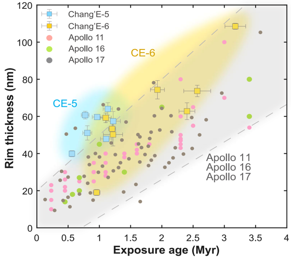 比較來(lái)自嫦娥五號(hào)、嫦娥六號(hào)、阿波羅11號(hào)、16號(hào)和17號(hào)任務(wù)的月壤顆粒中太陽(yáng)風(fēng)(SW)損傷層厚度與暴露年齡的關(guān)系。不同任務(wù)的樣品以不同符號(hào)區(qū)分:淺藍(lán)色方形代表嫦娥五號(hào)(Chang’E-5),黃色方形代表嫦娥六號(hào)(Chang’E-6),粉紅色圓形代表阿波羅11號(hào)(Apollo 11),綠色圓形代表阿波羅16號(hào)(Apollo 16),灰色圓形代表阿波羅17號(hào)(Apollo 17)。淺藍(lán)色與黃色陰影區(qū)域分別表示嫦娥五號(hào)(CE-5)與嫦娥六號(hào)(CE-6)數(shù)據(jù)的典型范圍。淺灰色陰影區(qū)域(由兩條虛線(xiàn)和圖邊界限定)表示大多數(shù)阿波羅任務(wù)(11、16、17號(hào))樣品數(shù)據(jù)的分布范圍。