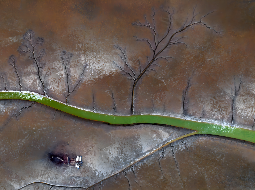 潮溝是沙泥質潮灘由于潮流作用而形成的沖溝,其發(fā)育依賴于沉積與侵蝕之間的平衡,是潮灘海陸相互作用最活躍的微地形單元,也是陸地和海洋生態(tài)系統(tǒng)之間物質能量交換的重要渠道。它依海潮影響而漲落盈虧,呈現(xiàn)雙向流動。我國的黃河三角洲發(fā)育了密集的潮溝系統(tǒng),在空中看,潮溝宛如一棵棵大樹被刻畫在潮灘之上,這些大樹有著粗壯的主干,主干上伸出一條條支干,支干上再發(fā)育出一根根枝條,是大自然的又一鬼斧神工。(本圖由無人機在約210米空中拍攝并由軟件拼接)