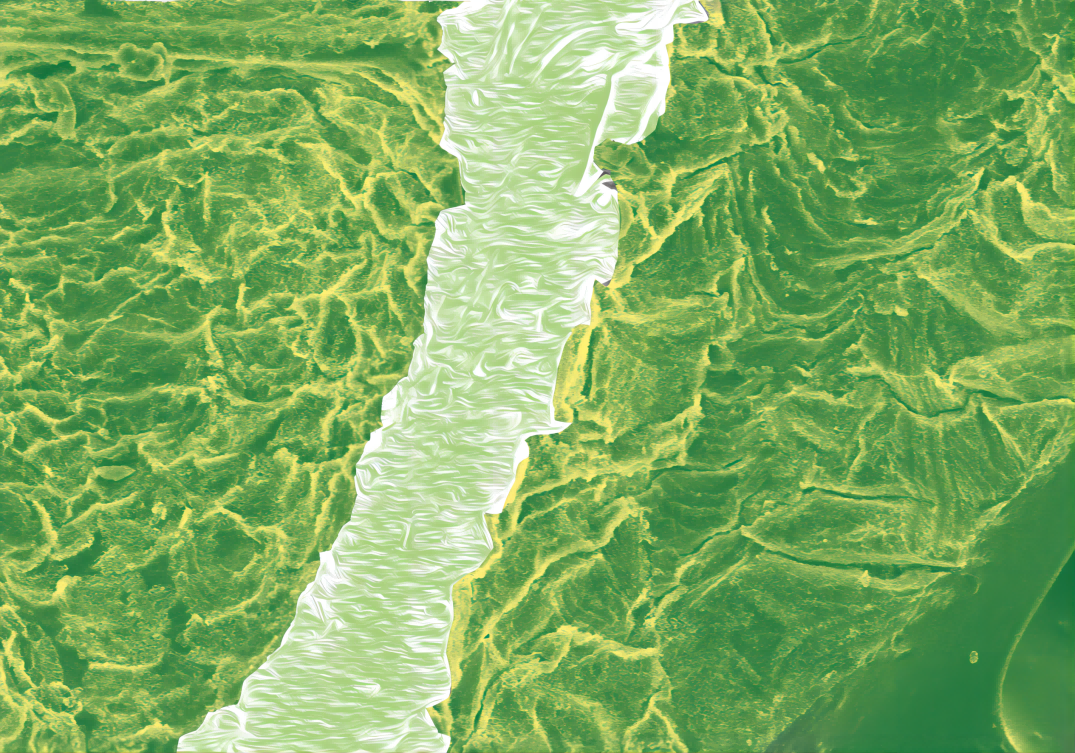 綠水青山亦是金山銀山,也是我們向往的生活。在本作品中,我們通過PS上色,將因石墨烯納米片在聚合物凝膠網(wǎng)絡上富集而形成獨特的褶皺結(jié)構(gòu)視為青山,而將聚合物內(nèi)部平滑的結(jié)構(gòu)視為綠水,呈現(xiàn)出一幅青山綠水,萬物勃發(fā)之景。