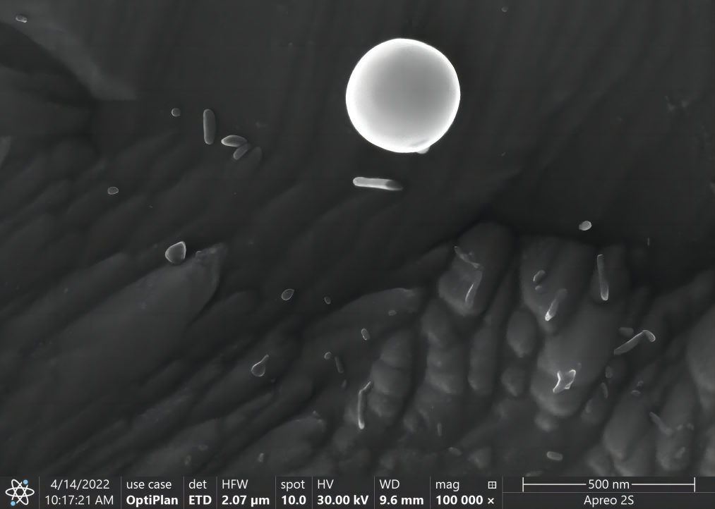 本作品為銅鉻鋯合金球狀納米級析出相在基體中形貌,通過合理控制時效工藝制度,可實現(xiàn)析出相細小、彌散分布,從而獲得良好的合金強韌化效果。本作品中觀察到的一個白亮球狀析出相在黑色背底襯度下好像夜空中一輪皎潔的月亮,而基體中組織則呈現(xiàn)出層疊的山巒與洶涌的波濤,正如杜甫詩“星垂平野闊,月涌大江流”描述的雄渾闊大的景象,也反映出一種胸襟曠遠的人生態(tài)度。