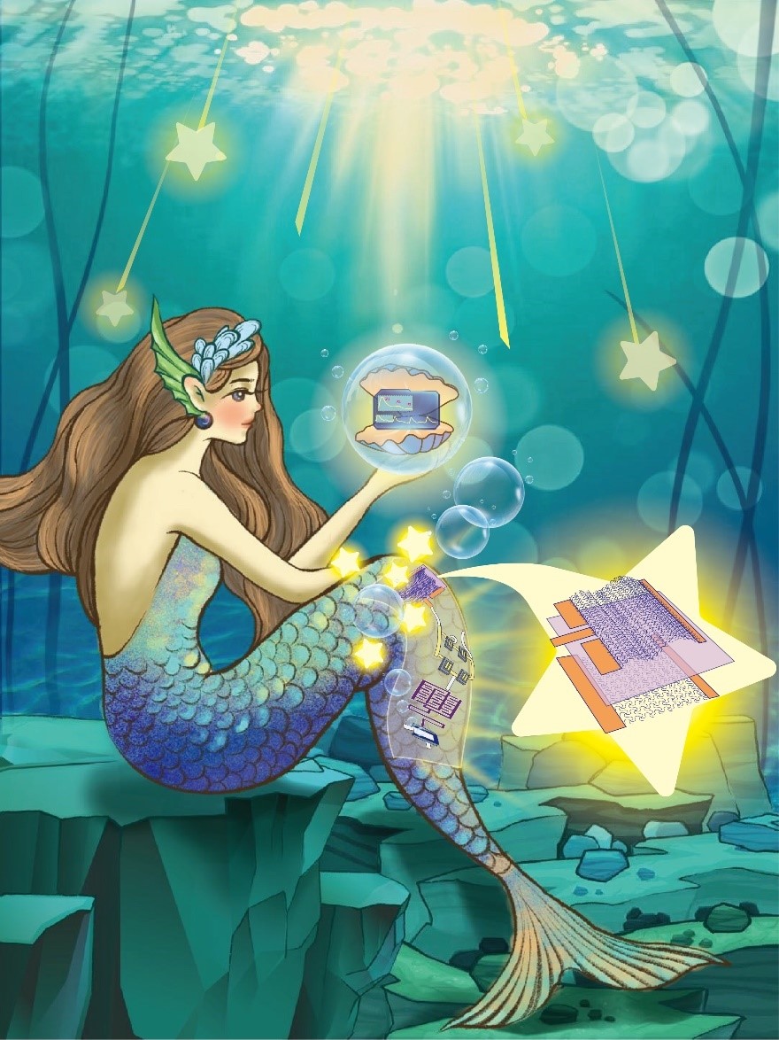 柔性電子像美人魚的尾巴一樣柔軟、親膚、舒適,可以用來監(jiān)測(cè)人體的各種生命體征,然而作為能源供給,電池則在短期內(nèi)無法突破可拉伸,于是利用環(huán)境射頻能量捕獲來獲取我們生活空間中的電磁波給傳感器供電從而實(shí)時(shí)監(jiān)測(cè)人體的健康看來是一種十分有效的方式,如圖中描繪,通過使用星星中的雙拱天線可以耦合到環(huán)境中的射頻能量,讓能量撒在美人魚身上,傳感器得到的信息可以再通過這個(gè)天線傳到美人魚的手機(jī)里,讓她實(shí)時(shí)地看到自己的健康信息。