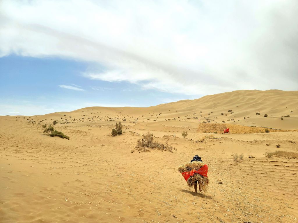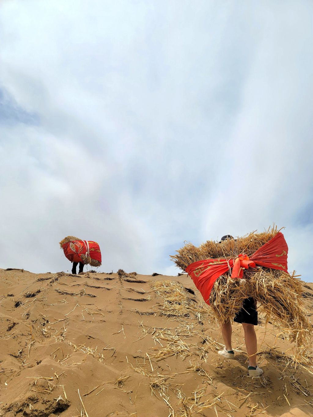 此組作品拍攝于2022年7月的某個午后,灼熱的陽光烘烤著敦煌莫高窟頂的黃沙,科研人員與工人正在沙丘區(qū)做草方格壓沙保護莫高窟的工作。因沙丘區(qū)車輛無法到達施工點,故需由人工背負壓沙用的麥草步行300米左右送達指定位置,每捆麥草約40公斤,負重前行且沙地有較大坡度,行進極為吃力,特抓拍科研工作者工作第一現場的背景照,生動詮釋甘于奉獻、吃苦耐勞、不畏艱險、勇往直前的“駱駝精神”。