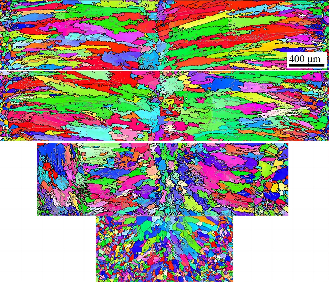 圖片中展示了核聚變工程實驗堆中真空室的結(jié)構(gòu)材料奧氏體不銹鋼經(jīng)過電子束焊接得到的焊接接頭微觀組織形貌。微觀組織分析采用的是電子背散射衍射分析方法,需要對較厚的板材進(jìn)行加工、切割、研磨、拋光、腐蝕等一系列的處理,才能在場發(fā)射掃描電鏡中進(jìn)行觀察。除此之外,為了觀察貫穿橫向的組織形貌,對多組照片進(jìn)行了拼接處理。圖中從上到下的內(nèi)容分別為焊接接頭從上到下的焊縫組織,可以看出晶粒組織從上到下逐漸細(xì)化。