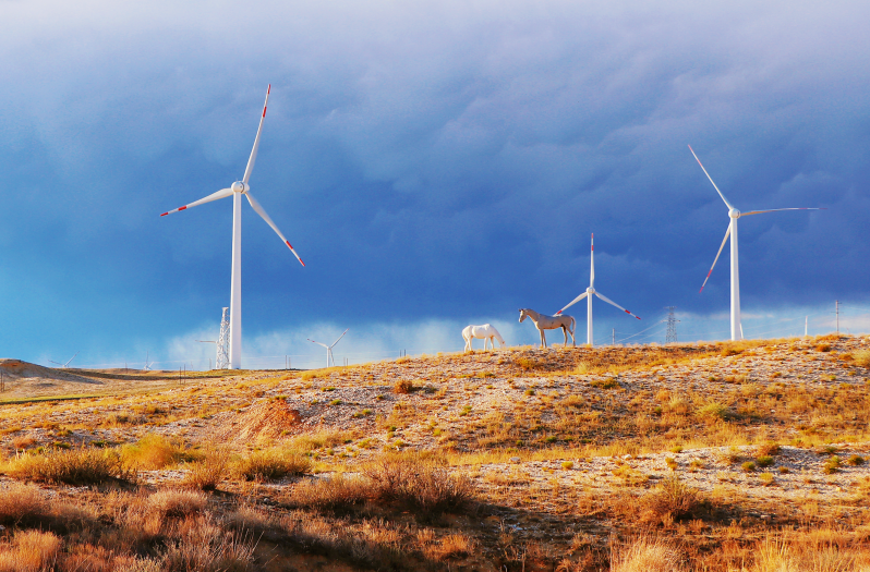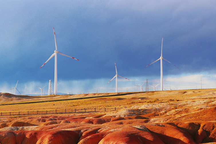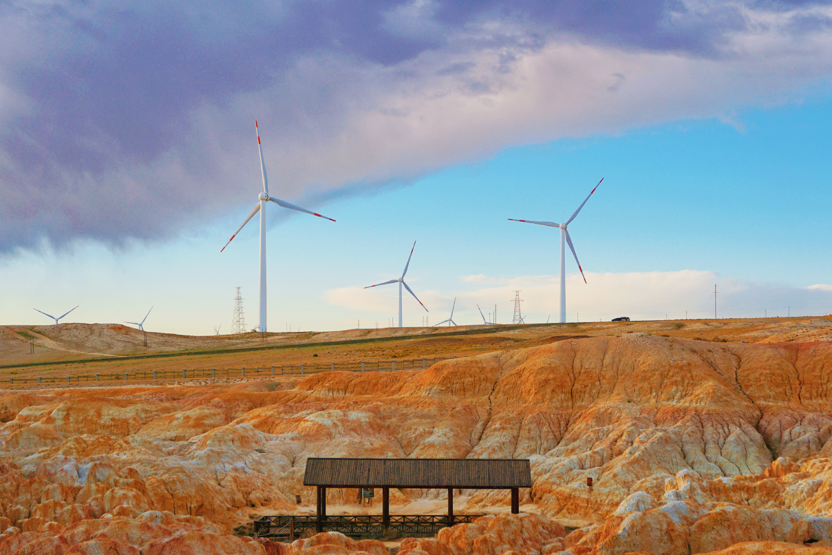 風(fēng)電作為一種清潔、可再生能源,對(duì)我國(guó)如期實(shí)現(xiàn)碳達(dá)峰、碳中和目標(biāo)有著重要意義。本組照片拍攝于我國(guó)新疆的五彩灘景區(qū)附近,該區(qū)域地域遼闊、風(fēng)能資源尤其豐富,因此建設(shè)了大型的風(fēng)力發(fā)電網(wǎng)站。相對(duì)傳統(tǒng)的火電、核電等發(fā)電方式,通過風(fēng)輪機(jī)將風(fēng)能轉(zhuǎn)化為機(jī)械能,再拖動(dòng)發(fā)電機(jī)發(fā)電要更加綠色、環(huán)保。呼呼的大風(fēng)不僅帶動(dòng)著風(fēng)車工作,也悄悄雕琢形成了當(dāng)?shù)鬲?dú)特的地貌特征,由于巖層間抗風(fēng)化能力的強(qiáng)弱程度不一,形成了參差不齊的輪廓,巖石礦物質(zhì)成分的不同又幻化出斑斕色彩,美輪美奐,讓人心曠神怡。