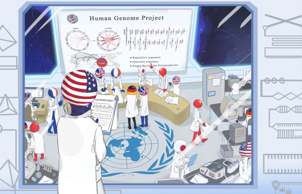 漫畫(huà)主體為美國(guó)、英國(guó)、法國(guó)、德國(guó)、日本、中國(guó)通力合作,通過(guò)生物學(xué)、化學(xué)、密碼學(xué)、物理學(xué),計(jì)算機(jī)科學(xué)等手段,嘗試破譯和解讀蘊(yùn)藏在人類遺傳物質(zhì)中超過(guò)30億堿基的基因密碼。漫畫(huà)中展示有:Human Genome Project和HGP徽章,參考基因組(GRCh38),23對(duì)染色體的形態(tài)和相對(duì)長(zhǎng)度,重復(fù)序列,插入序列(轉(zhuǎn)座、重組現(xiàn)象),單核苷酸多態(tài)性(SNP),聯(lián)合國(guó)徽章、“中心法則”和兩側(cè)背景墻上鐫刻的DNA復(fù)制、轉(zhuǎn)錄、翻譯過(guò)程,動(dòng)態(tài)規(guī)劃算法中的“全局比對(duì)”和“局部比對(duì)”。實(shí)驗(yàn)儀器包括:超低溫冰箱、凝膠成像儀、聚合酶鏈反應(yīng)核酸擴(kuò)增儀(PCR擴(kuò)增儀)、二代測(cè)序儀、電泳儀、離心機(jī)、移液槍、微型離心管、試管。