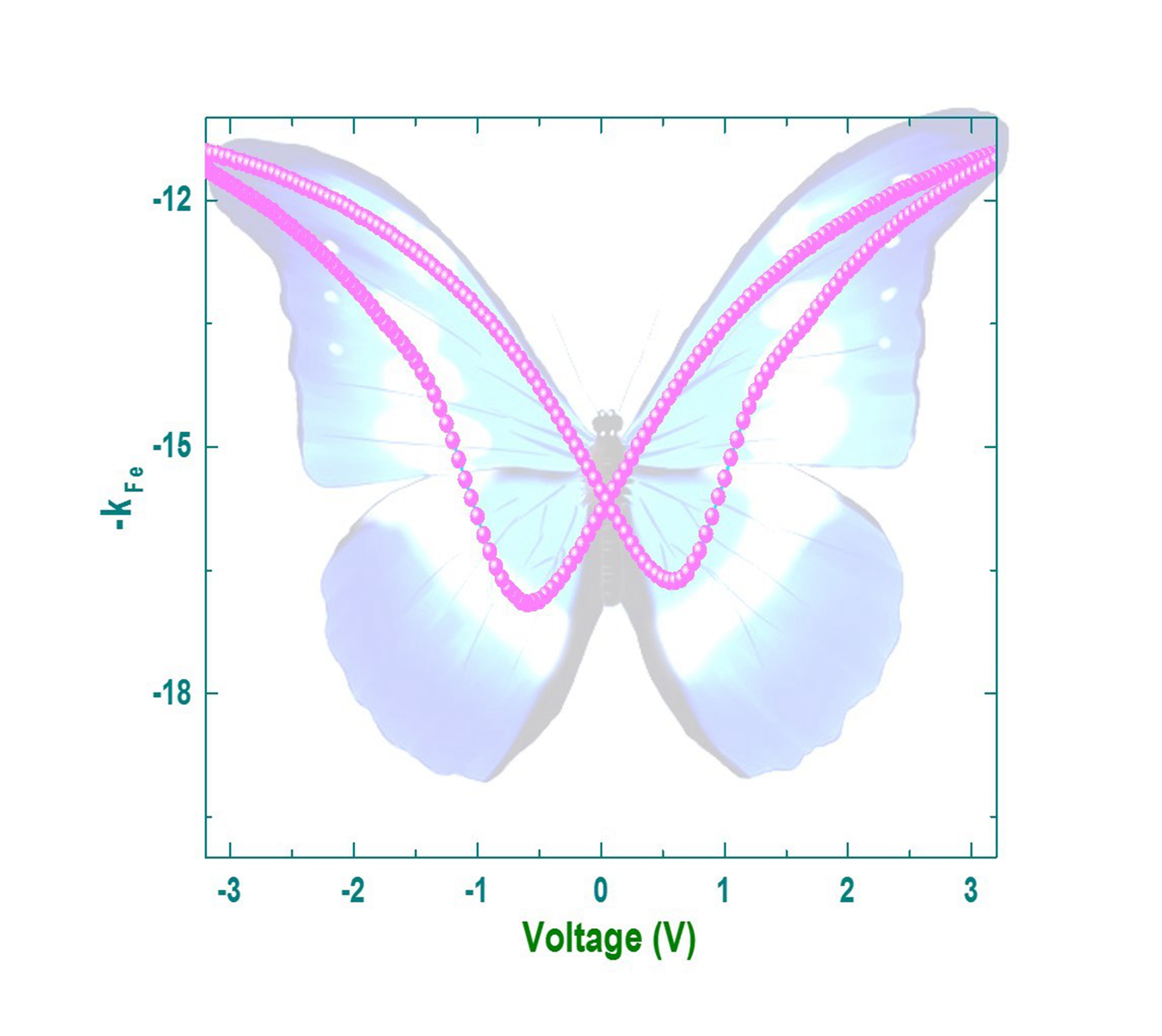 本作品展示的鐵電材料中的電容—電壓曲線的測(cè)試圖像,由于鐵電材料本身存在鐵電極化的特性,因此在掃描電壓下,鐵電材料中會(huì)出現(xiàn)鐵電極化現(xiàn)象,同時(shí)晶格常數(shù)也會(huì)發(fā)生相應(yīng)的變化,在監(jiān)測(cè)鐵電材料的鐵電電容,便會(huì)發(fā)現(xiàn)類(lèi)似蝴蝶的變化曲線,如同一直翩翩起舞的蝴蝶,從鐵電材料中緩緩飛出。