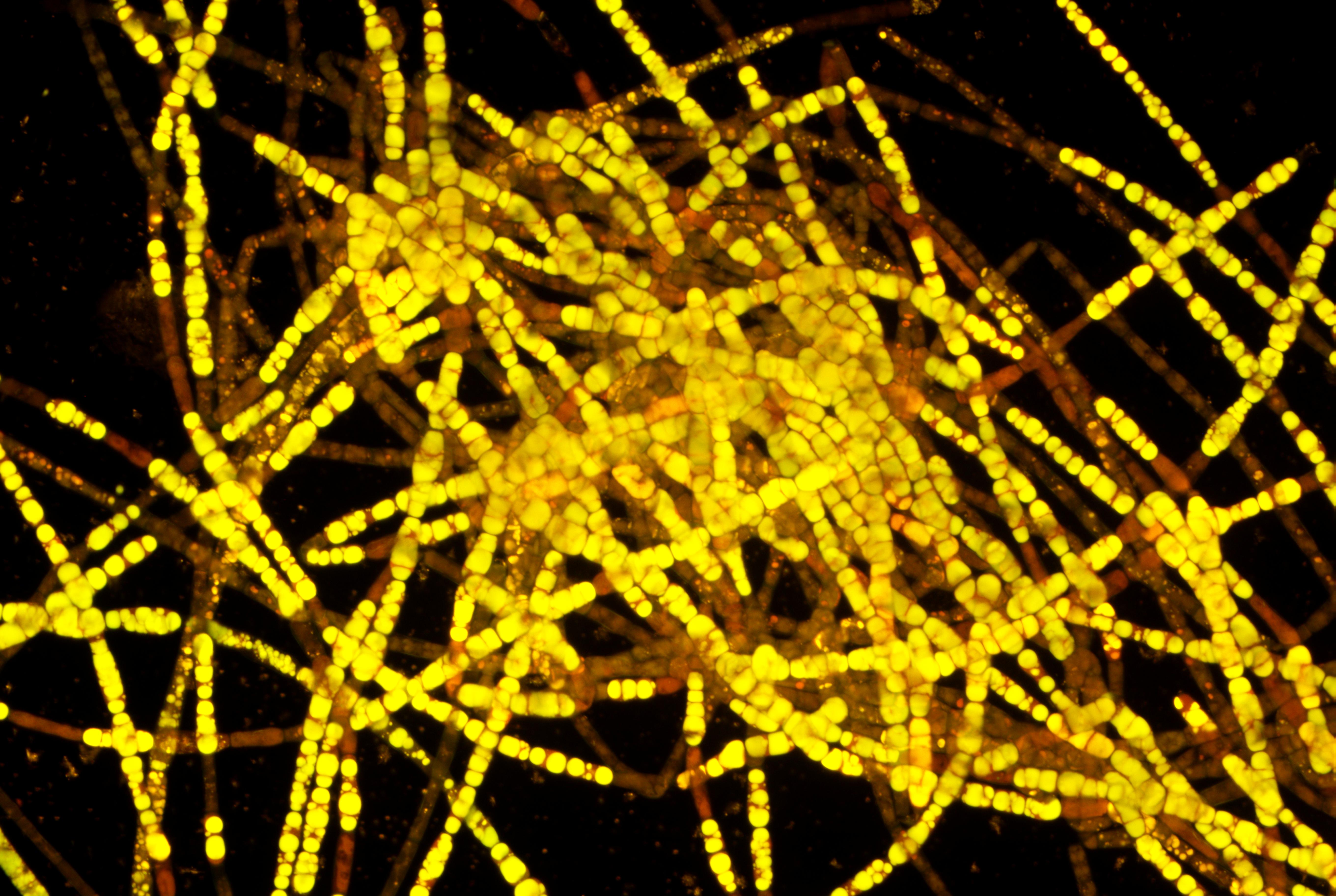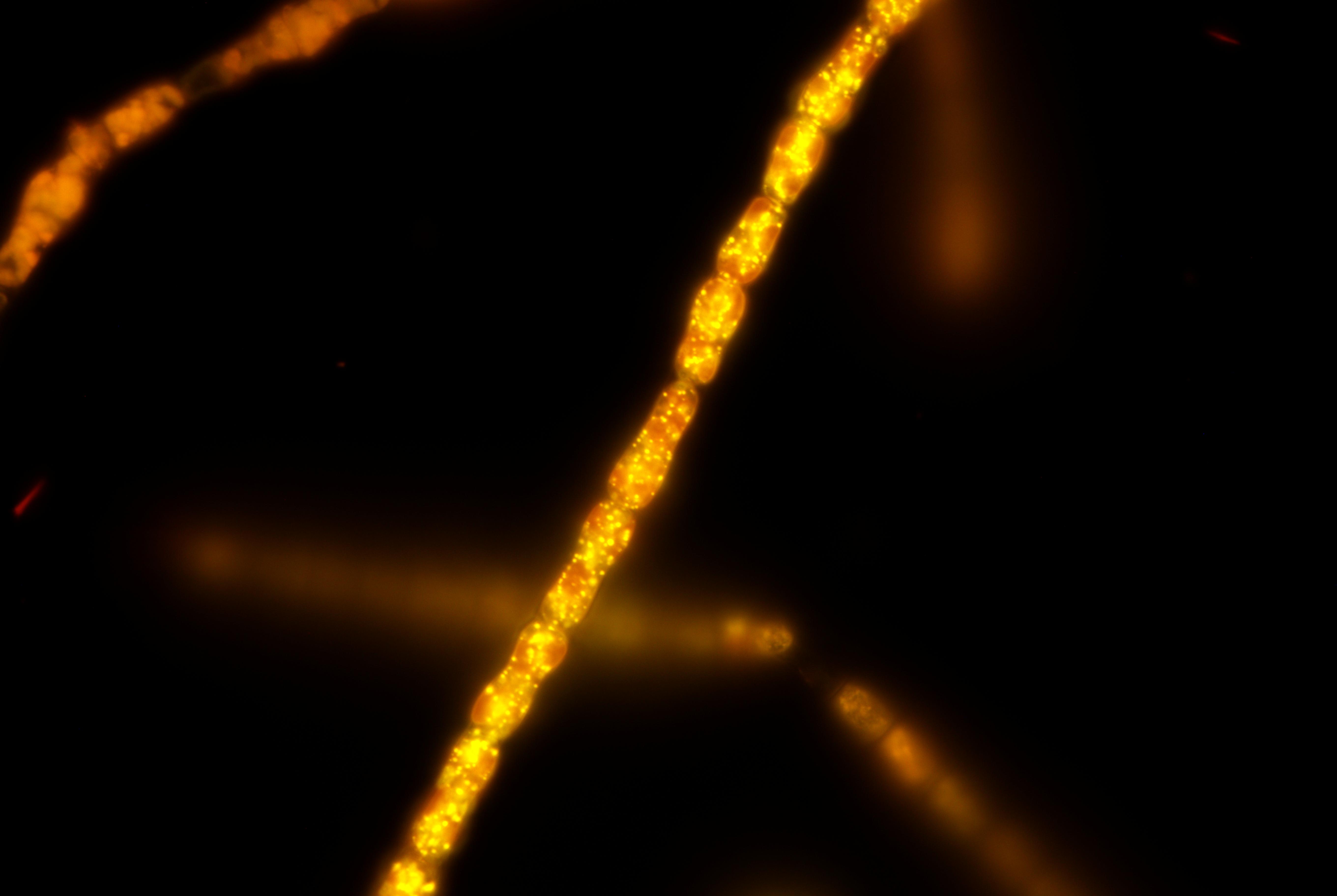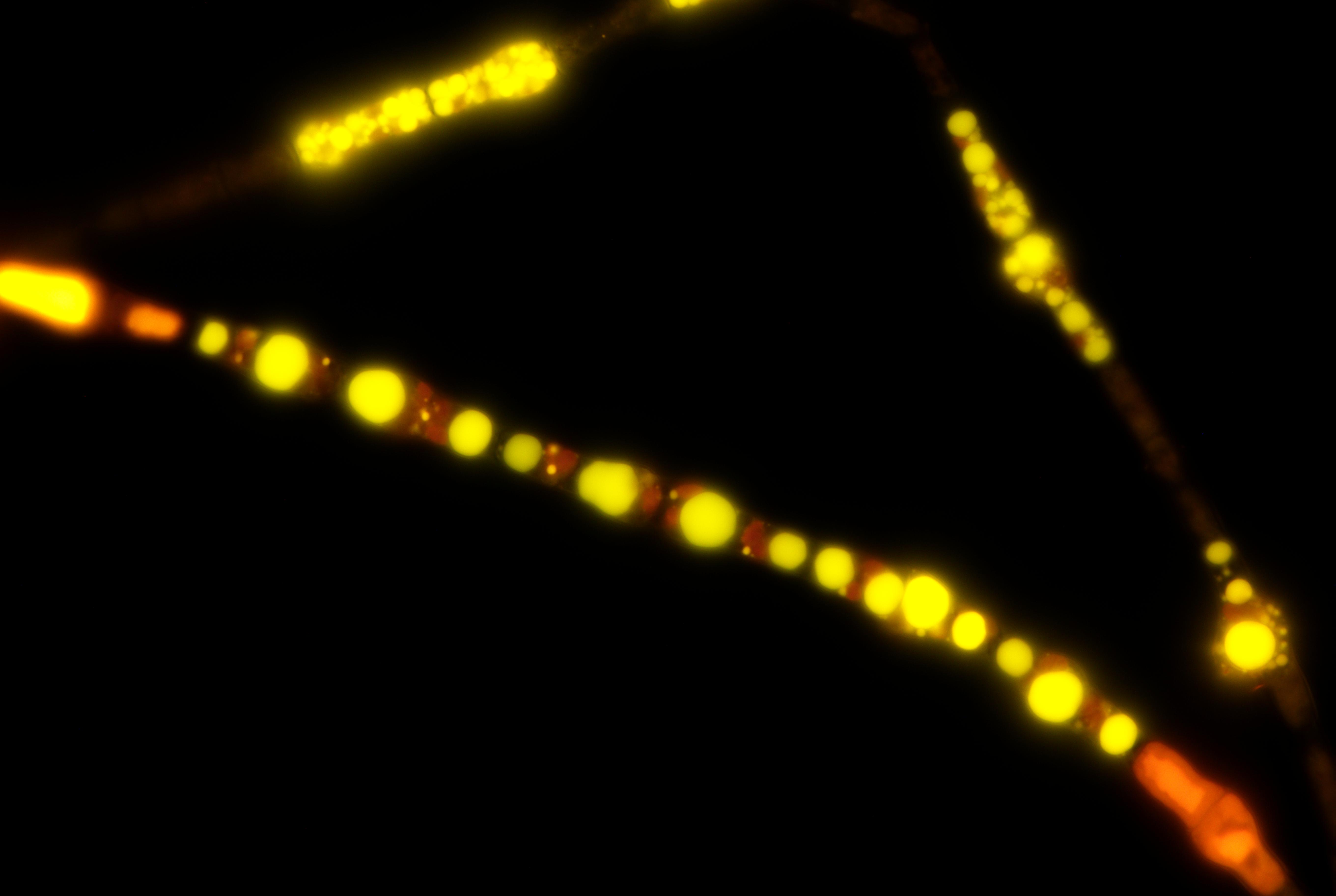 微藻細胞中的中性油脂經(jīng)尼羅紅染色后用藍光激發(fā)時會發(fā)出耀眼的黃色或橙色光芒。處于培養(yǎng)初期的黃絲藻細胞內(nèi)中性油脂含量較低,被染色后用熒光顯微鏡觀察可見油滴成散點狀,猶如群星閃耀的夜空(圖1,10*100倍);經(jīng)過誘導培養(yǎng)后,黃絲藻細胞內(nèi)中性油脂含量大幅提高,染色觀察時可見油滴幾乎占據(jù)了細胞的大部分空間,整列細胞宛若一條高空俯瞰下的燈火輝煌的街市(圖2,10*100倍),將這些“街市”匯集起來就呈現(xiàn)出一幅熱鬧非凡、火樹銀花的盛世景象(圖3,10*40倍),正如辛棄疾的詩詞:東風夜放花千樹,更吹落、星如雨。