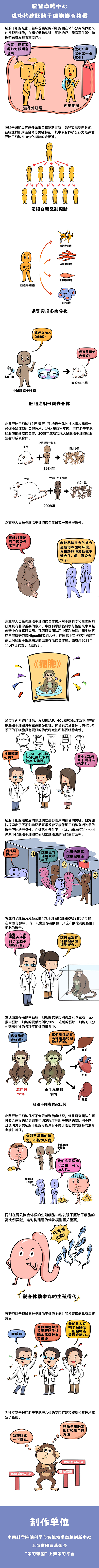 中國科學院腦科學與智能技術(shù)卓越創(chuàng)新中心在國際上首次成功構(gòu)建了高比例胚胎干細胞來源的出生存活嵌合體猴。該成果2023年11月9日發(fā)表于《細胞》。將注射了綠色熒光標記的4CL干細胞的胚胎移植到代孕母猴,有一只出生存活猴和一只流產(chǎn)猴檢測到胚胎干細胞的嵌合,在兩只嵌合體猴的胎盤組織和生殖細胞中均發(fā)現(xiàn)了胚胎干細胞的高比例貢獻。
