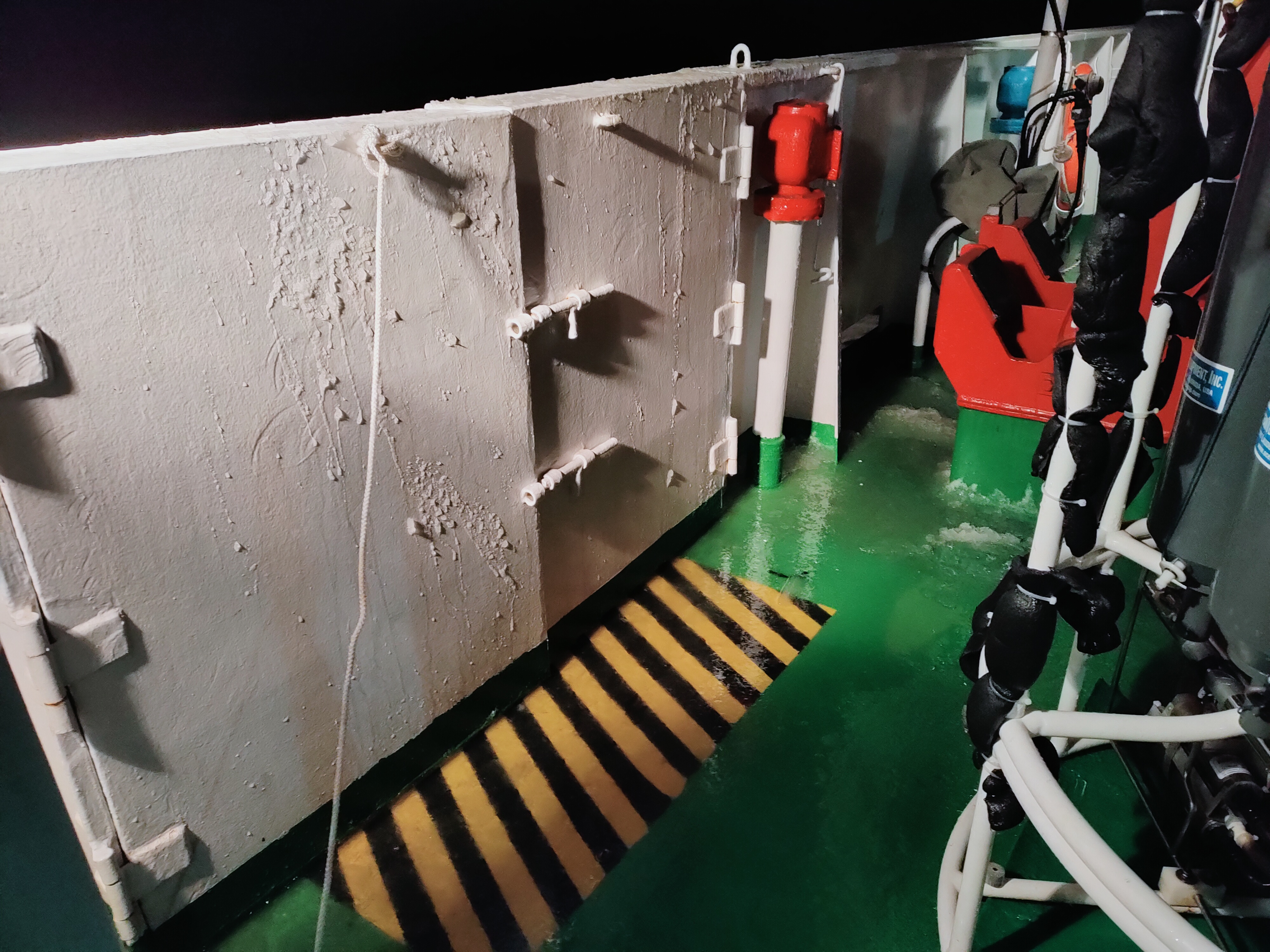 該照片于2022年2月,“創(chuàng)新一”科考船執(zhí)行中國科學(xué)院煙臺(tái)海岸帶研究所黃渤海冬季開放航次期間用手機(jī)拍攝所得。夜晚到站進(jìn)行CTD下放作業(yè)時(shí)海上突降大雪,在狂風(fēng)的加持下使得海水都結(jié)成冰,凍結(jié)在甲板上,掛在安全門和采水器的出水口上。科考隊(duì)員依然穿戴好救生衣、安全帽堅(jiān)守崗位,成功取得寶貴的冬季樣品。無論在哪,都有那一抹紅色如此溫暖而堅(jiān)定。