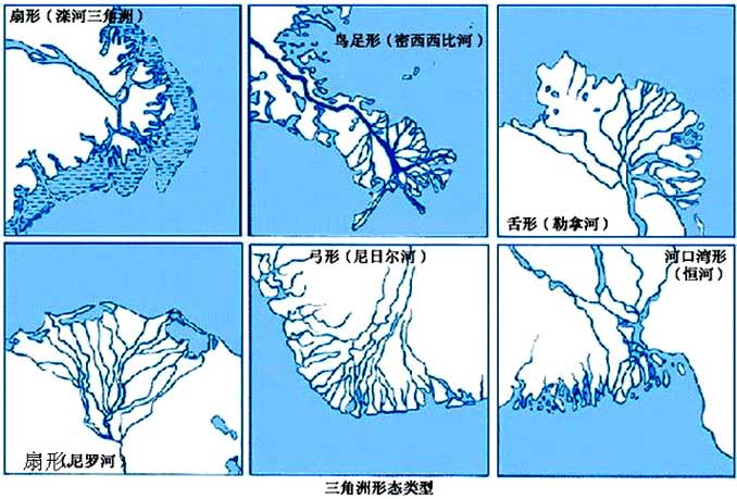 河口段的扇狀沖積平原。河流入海時(shí),因流速減低,所挾帶的大量泥沙,在河口段淤積延伸,填海造陸,洪水時(shí)漫流淤積,逐漸形成扇面狀的堆積體。黃河河口三角洲,就是許多不同時(shí)期形成的沖積扇,經(jīng)過若干時(shí)段,入海河口不斷淤積、延伸、改道,使沖積扇面積不斷擴(kuò)大,海岸線不斷向前推進(jìn),同時(shí)在不走河的區(qū)域,海岸線又明顯蝕退, 這種延伸和蝕退交替進(jìn)行,形成了現(xiàn)今的黃河口三角洲。1938年前以墾利縣寧海為頂點(diǎn),北起徒駭河口,南至支脈溝口的扇形地區(qū),面積約6000平方公里,海岸線長(zhǎng)180余公里。稱“近代黃河三角洲”。1949年后,由于人工控制入海流路,頂點(diǎn)下移至墾利縣漁洼附近,北起洮河,南至宋春榮溝,扇形面積約2600平方公里,稱“現(xiàn)代黃河三角洲”。