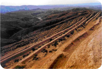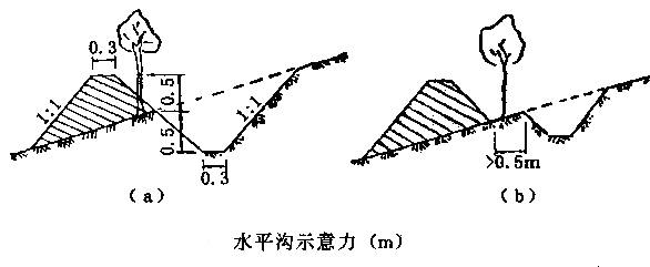 在坡面不平、覆蓋層較厚、坡度較大的丘陵坡地,采用水平溝,即沿等高線修筑,溝底用來攔截坡地上游降雨徑流,使其變?yōu)橥寥浪。水平溝的設(shè)計和修筑需依據(jù)坡面坡度、土層厚度、土質(zhì)和設(shè)計雨量而定。其原則是:水平溝的溝距和斷面大小,應(yīng)以保證設(shè)計頻率暴雨徑流不致引起坡面水土流失。陡坡、土層薄、雨量大,溝距應(yīng)小些;反之可大些。坡陡,溝深而窄;坡緩,溝淺而寬。一般溝距為3~5m,溝口寬0.7~1m,溝深0.5~1.0m。水平溝容積比魚鱗坑大,故蓄水量也大。為防止山洪過大沖壞地埂,每隔5~10m,設(shè)置瀉洪口,使超量的徑流導(dǎo)入山洪溝中。為使雨水在溝中均勻,減少流動,每隔5~10m,留—道土擋,其高度為溝深的1/2~1/3。
