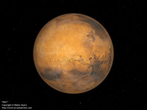 火星(Mars)太陽系八顆行星之一,按離太陽由近及遠(yuǎn)的次序?yàn)榈谒念w。中國古代又加它為“熒惑”。肉眼看去,火星是一顆引入注目的火紅色星。它同地球的距離不斷變化,因此它的亮度也不斷變化:最暗時(shí)的視星等約為+1.5等;最亮?xí)r則達(dá)到-2.9等,比最亮的恒星天狼還亮得多;鹦怯袃蓚(gè)衛(wèi)星,即火衛(wèi)一(Phobos)和火衛(wèi)二(Deimos)。