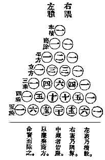 - 十一世紀(jì)中葉,宋朝的《黃帝九章算術(shù)細草》中,創(chuàng)造了開任意高次冪的“增乘開方法”,列出二項式定理系數(shù)表,這是現(xiàn)代“組合數(shù)學(xué)”的早期發(fā)現(xiàn)。后人所稱的“楊輝三角”即指此法(中國賈憲)。