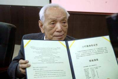 剛剛度過93歲生日的陳省身2日說:“把我的名字跟天上的星星聯(lián)系在一起,我非常榮幸。我是研究數(shù)學的,數(shù)學歷史上最偉大的數(shù)學家是高斯,他最早的工作就是小行星的研究,F(xiàn)在我有機會跟小行星有聯(lián)系,覺得非?鞓。”