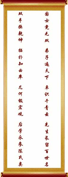 6月28日,丘成桐在接受記者采訪時(shí)說:“遠(yuǎn)遠(yuǎn)看到對(duì)聯(lián)掛在那里,感到很高興。這是陳先生生前希望見到的事情,他希望我的對(duì)聯(lián)掛在大廳里,本來還希望我自己來書寫。我對(duì)他說,我的書法不登大雅之堂!薄