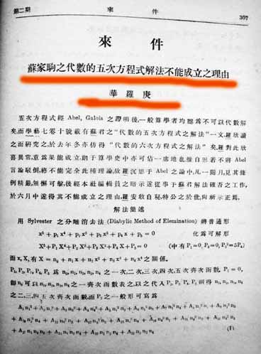 華羅庚的第一篇文章在《科學(xué)》上發(fā)表不僅給了華羅庚極大的鼓勵,也拉近了他與《科學(xué)》雜志的距離。之后他就把自己質(zhì)疑蘇家駒論點的文章又發(fā)給了《科學(xué)》編輯部,1930年12月出版的《科學(xué)》15卷2期上以“來件”的方式發(fā)表了《蘇家駒之代數(shù)的五次方程式解法不能成立之理由》。