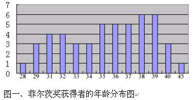下表是歷屆的菲爾茲獎獲得者的名單,我們對獲獎者的年齡進行初步的分析統(tǒng)計,列在圖一中。 |