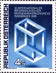 奧地利于1981年9月14日發(fā)行了一枚郵票,這次國際會議是在Innsbruck召開。上面的文字是說 "Impossible Construction of Cube" by M. C. Escher. " |