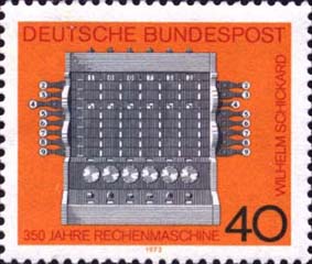 德國1973年6月12日發(fā)行了為紀(jì)念由Tubingen大學(xué)Wilhelm Schickard教授建造計算機350周年的郵票。 |