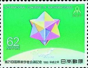 在歐洲和北美洲以外舉辦的第一次國際數(shù)學(xué)家大會于1990年在京都召開。紀(jì)念郵票的圖案是一個日本折紙構(gòu)成的多面體。 |