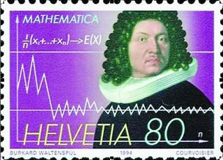 1994年,國際數(shù)學(xué)家大會第三次在蘇黎士召開,當(dāng)時發(fā)行的紀(jì)念郵票的圖案是伯努利和他的大數(shù)律。 |