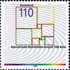 德國為紀(jì)念1998年國際數(shù)學(xué)家大會在柏林召開而柏林設(shè)計的郵票。這是“矩形求方”問題的一種解法,該問題是要把整數(shù)邊的矩形分成具有整數(shù)邊的大小不等的正方形。 |