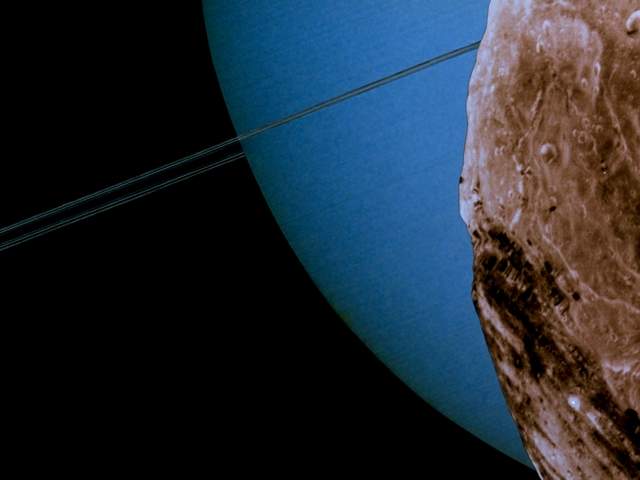 天王星和天衛(wèi)五,后面蘭色的是天王星,黑色的細(xì)線即為它的光環(huán)