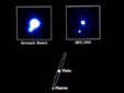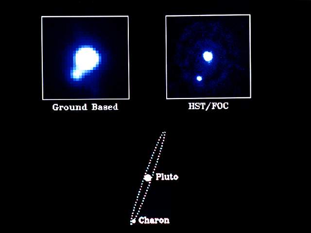 冥王星和它的衛(wèi)星查龍, 左上圖為地基望遠(yuǎn)鏡拍攝的照片, 右上圖為哈勃空間望遠(yuǎn)鏡所攝照片