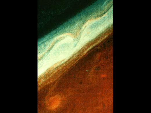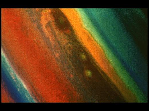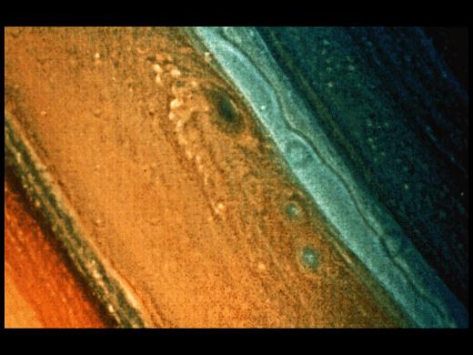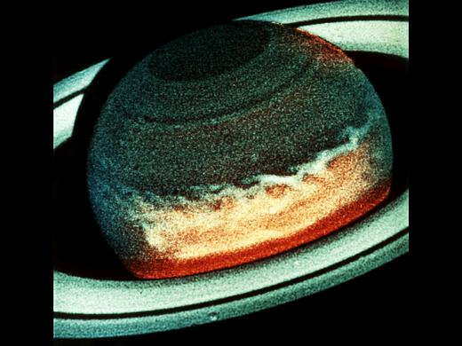 旅行者號探測器發(fā)現(xiàn)土星也有一個大紅斑,長8000千米,寬6000千米,比木星的小許多。它可能是由于土星大氣中上升氣流重新落入云層時引起擾動和旋轉(zhuǎn)而形成的。